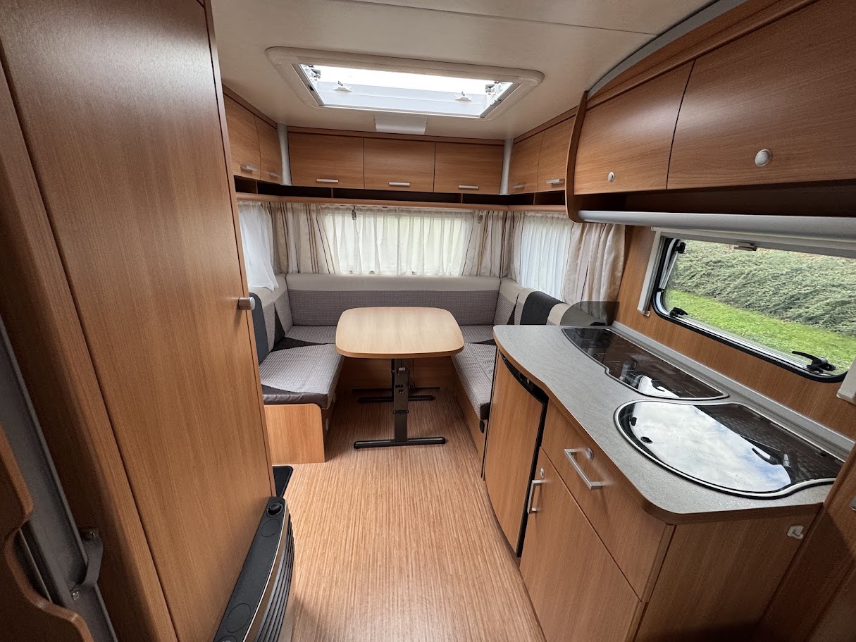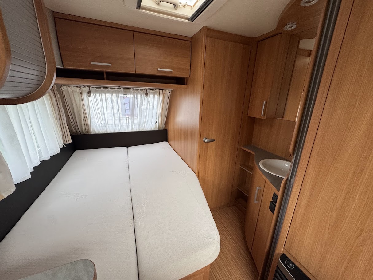 Indeling : vast bed met lattenbodem, rondzitsalon, keuken met 3 gasbekken, koelkast met diepvries. Badkamer met cassettetoilet en lavabo.