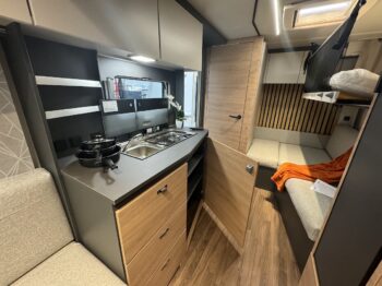 Keuken : 2-pits kooktoestel, grote koelkast met diepvries, warmwaterboiler, verswatertank 45 liter, niveaumeter voor verswatertank